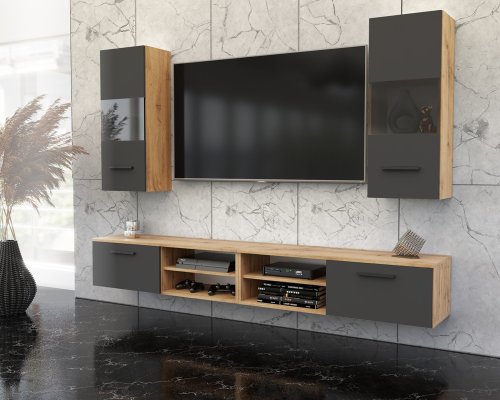 Meblościanka BANDLE to nowoczesny zestaw mebli wiszących, który doskonale wpasuje się w każdy salon. Jej przemyślana konstrukcja łączy estetykę z funkcjonalnością. Dzięki przestronności, oferuje idealne miejsce do przechowywania oraz eksponowania dekoracji i sprzętów multimedialnych.