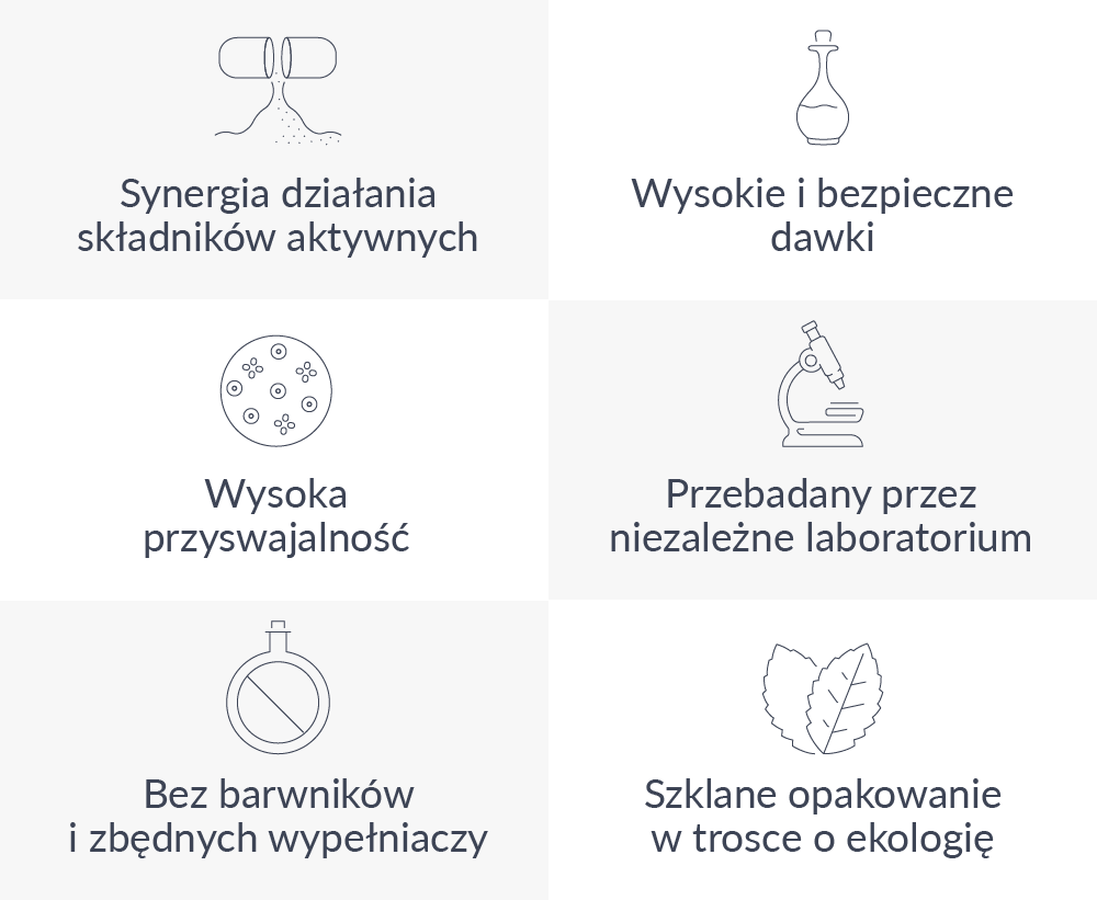 Każdy produkt został przebadany pod kątem zgodności z deklarowanym składem i braku zanieczyszczeń przez niezależne laboratorium. Suplementy diety zostały wyprodukowane przez producenta posiadającego certyfikaty gwarantujące jakość i bezpieczeństwo produkcji: ISO 22000 – dla produkcji suplementów diety, ISO 14485 – dla wyrobów medycznych, GMP (Good Manufacturing Practice) – dla leków.