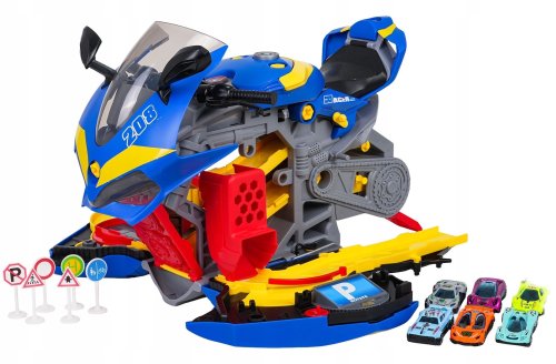 Ten interaktywny motocykl został wyposażony w świecące reflektory oraz tylne światła, co sprawia, że zabawa staje się jeszcze bardziej ekscytująca. Po otwarciu boków motocykla, zabawka przekształca się w rozbudowane parkowanie z torami, stacjami paliw i innymi elementami, co zapewnia wiele godzin radości i kreatywnej zabawy.