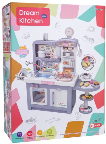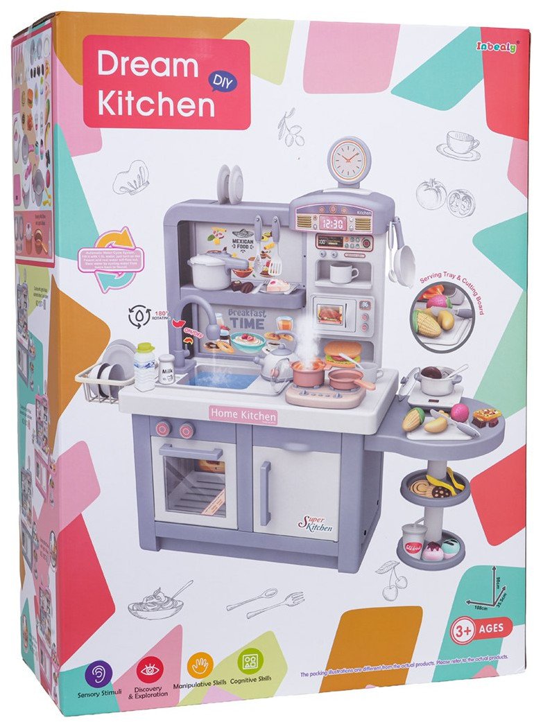Kuchnia jest wyposażona w mikrofalówkę, zlewozmywak z kranem, płytę indukcyjną, piekarnik, ekspres do kawy oraz lodówkę. W zestawie znajduje się również bogaty asortyment akcesoriów kuchennych, takich jak garnki, sztućce, talerze, czajnik, kubki oraz różnorodne produkty do zabawy, w tym owoce i warzywa na rzepy. Realistyczne dźwięki gotowania i smażenia dodają autentyczności każdej kulinarnej przygodzie.