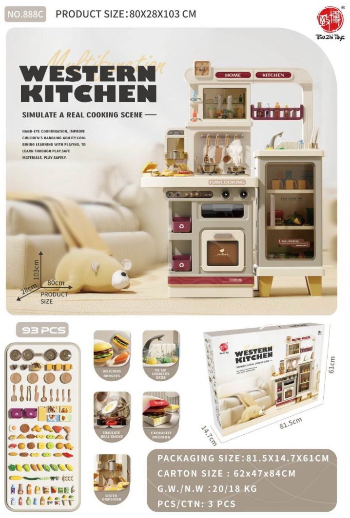 W skład zestawu wchodzi aż 93 elementy, w tym różnorodne akcesoria kuchenne oraz imitacje jedzenia. Dzieci znajdą tu garnki, patelnie, czajnik, talerze, sztućce, a także wiele innych przydatnych akcesoriów, takich jak łopatka, tarka czy kosze na śmieci. Dzięki temu zestawowi, mali kucharze mogą tworzyć swoje własne kulinarne arcydzieła!