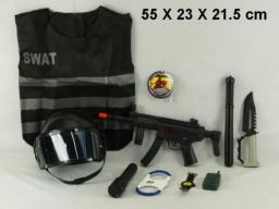 Zestaw policyjny zawierający kamizelkę, hełm, karabin, baton, nóż, latarkę, kajdanki, zegarek, walkie-talkie oraz odznakę.