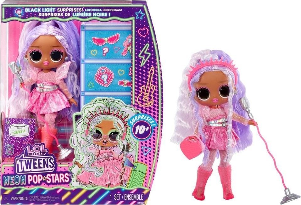 Zaprezentuj swój styl gwiazdy pop i wkrocz na scenę z zupełnie NOWĄ lalką L.O.L. Surprise Tweens Neon Dance Kitty K! Rozpakuj niespodzianki w stylu gwiazdy popu, w tym wspaniałą lalkę Tweens Fashion, stylowe stroje, efektowne buty, modną torebkę, piękną gitarę, uroczy mikrofon, okulary w kształcie serca, urocze kolczyki, grzebień do włosów i wiele więcej! Świecąc dołączoną latarką UV odkryj dodatkowe niespodzianki na jej włosach, stylizacjach i dodatkach! Każda lalka modowa ma oszałamiające cechy, pięknie ułożone włosy i jest ruchoma! Przygotuj swoją Tween na najlepszy koncert!