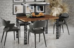 Loftowy stół rozkładany MATIO do jadalni Stół rozkładany MATIO to wyjątkowa propozycja dla osób poszukujących nietuzinkowego i funkcjonalnego stołu do jadalni. Ten model wyróżnia się spośród innych stołów dzięki ciekawie zaprojektowanym nogom o ażurowym wzornictwie, które w połączeniu z blatem tworzą atrakcyjną i nowoczesną kompozycję. Nogi stołu wykonane są z wytrzymałego metalu, co pomimo ażurowego wzoru zapewnia doskonałą stabilność mebla. Dodatkowo czarny metal został pomalowany proszkowo, co skutecznie chroni go przed wpływem wilgoci, zapewniając długotrwałą ochronę przed rdzą. Blat stołu w kolorze dąb monastery i o grubości 3,6 cm wykonany jest z wysokiej jakości płyty meblowej o zaokrąglonych krawędziach, które pokryte są tworzywem ABS. Takie wykończenie prezentuje się nie tylko estetycznie, ale również skutecznie chroni loftowy stół przed uszkodzeniami mechanicznymi oraz wilgocią. Dzięki temu można cieszyć się pięknym wyglądem stołu przez długi czas. Stół jest rozkładany, co pozwala na elastyczne dostosowanie jego wielkości do potrzeb. Rozkładanie jest bardzo proste dzięki zastosowaniu prowadnic synchronicznych, co oznacza, że wystarczy pociągnąć blat z jednej strony, a druga automatycznie rozsunie się równocześnie. Warto zaznaczyć, że powierzchnia blatu stołu w dotyku przypomina drewno, co dodaje mu uroku i wpływa na estetykę całego mebla. To połączenie nowoczesnego designu z ciepłym wykończeniem sprawia, że stół doskonale komponuje się w aranżacjach loftowych oraz nowoczesnych wnętrzach. Co więcej, stół rozkładany MATIO to produkt polski, co może stanowić dodatkowy atut dla osób ceniących wyroby lokalne. Dzięki swojej kolorystyce i stylistyce ten nowoczesny stół będzie idealnym uzupełnieniem wielu wnętrz, dodając im unikatowego charakteru i funkcjonalności. Cechy produktu produkt polski, blat wykonany z wysokiej jakości płyty meblowej w kolorze dąb monastery, krawędzie płyty wykończone obrzeżami ABS, rozkładany blat z wkładkami przechowywanymi osobno, podstawa z metalu malowanego proszkowo na kolor czarny, nogi ażurowe, do samodzielnego montażu, w swojej ofercie posiadamy szeroki wybór mebli pozwalających na kompleksowe wyposażenie mieszkania.