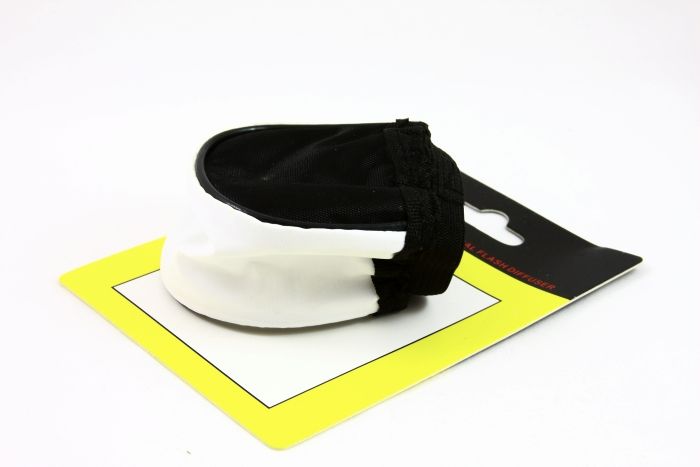 Dyfuzor MINI SOFTBOX firmy MICNOVA posiada uniwersalne mocowanie na gumce, dzięki temu możemy go zamocować do każdej lampy błyskowej o szerokości do 85mm i wysokości od 50mm