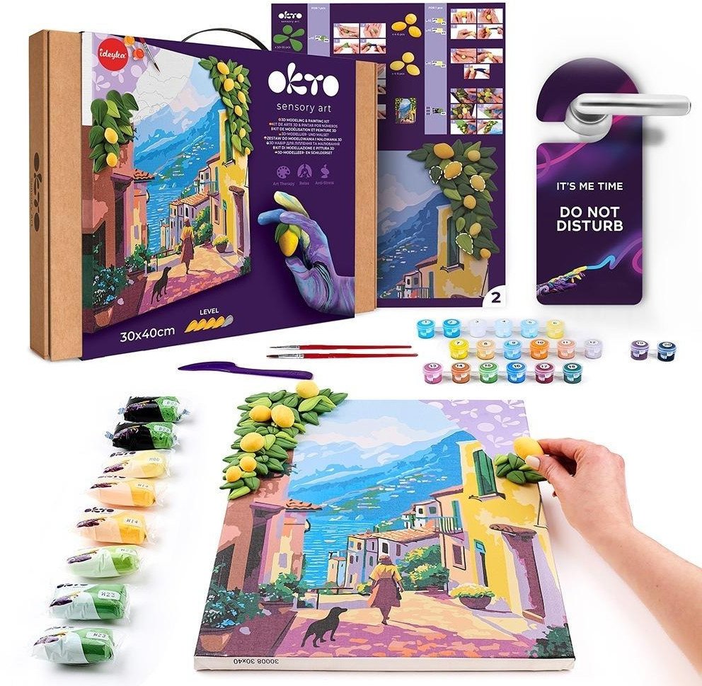 Dzięki zestawowi OKTO Lemon Weekend 3D do modelowania i malowania nie tylko odtworzysz widok Ty w nim zamieszkasz. Dotknij faktury brukowanej uliczki, ulep soczyste cytryny i podążaj za światłem tańczącym na tafli jeziora.