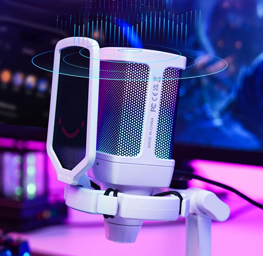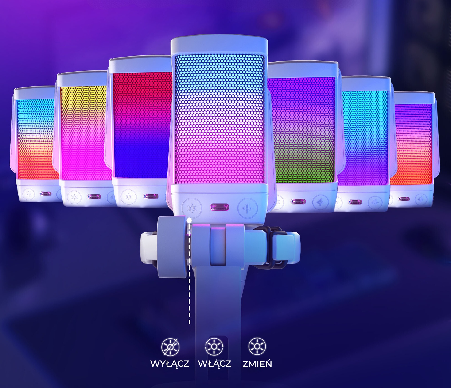 Fifine Q6 posiada wbudowane podświetlenie RGB, które pełni funkcję estetyczną i podkreśla charakter stanowiska gamingowego. Żywa kolorystyka sprawia, że mikrofon prezentuje się atrakcyjnie w kadrze kamery podczas transmisji na żywo, dodając dynamiki wizualnej każdej konfiguracji sprzętowej.