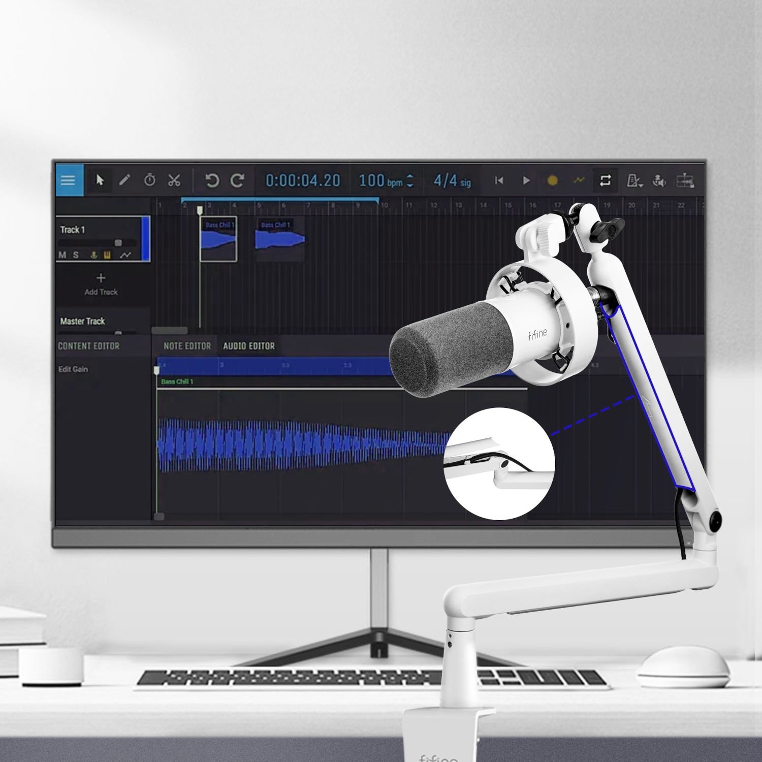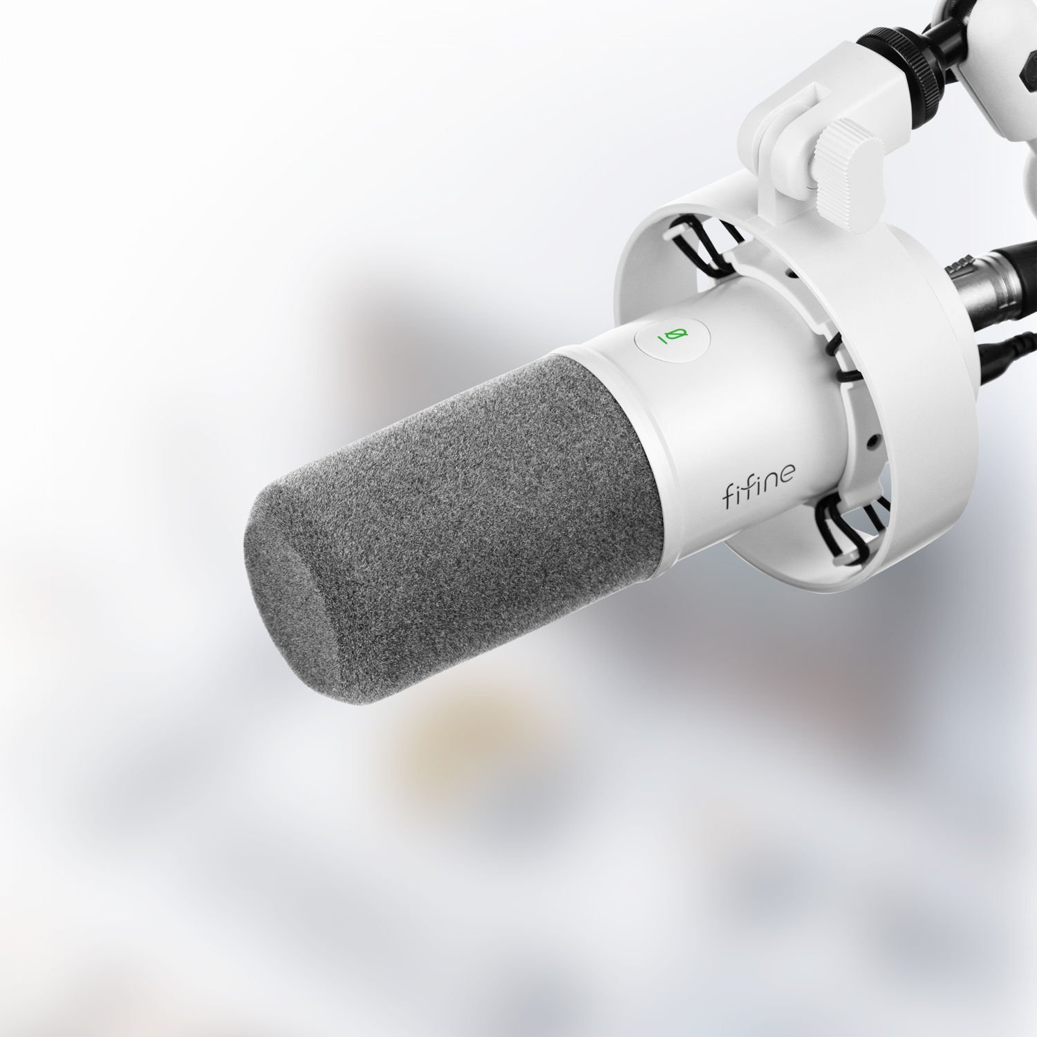 Na dole mikrofonu znajdują się również dwa pokrętła do regulacji głośności mikrofonu i słuchawek. Zaletą tego, że elementy sterujące znajdują się pod spodem, jest to, że nie będą one przeszkadzać podczas mocowania mikrofonu na wysięgniku (nie ma w zestawie). W dolnej części znajduje się również podłączenie słuchawek do odsłuchu nagrania w czasie rzeczywistym (słuchawki od 16 do 75 ohm). Na froncie obudowy znajduje się również dotykowy przycisk wyciszający mikrofon wraz ze wskaźnikiem LED o aktualnym statusie pracy mikrofonu. W zestawie znajduje się mikrofon, przewód USB, statyw Fifine BM88 oraz kosz antywibracyjny.