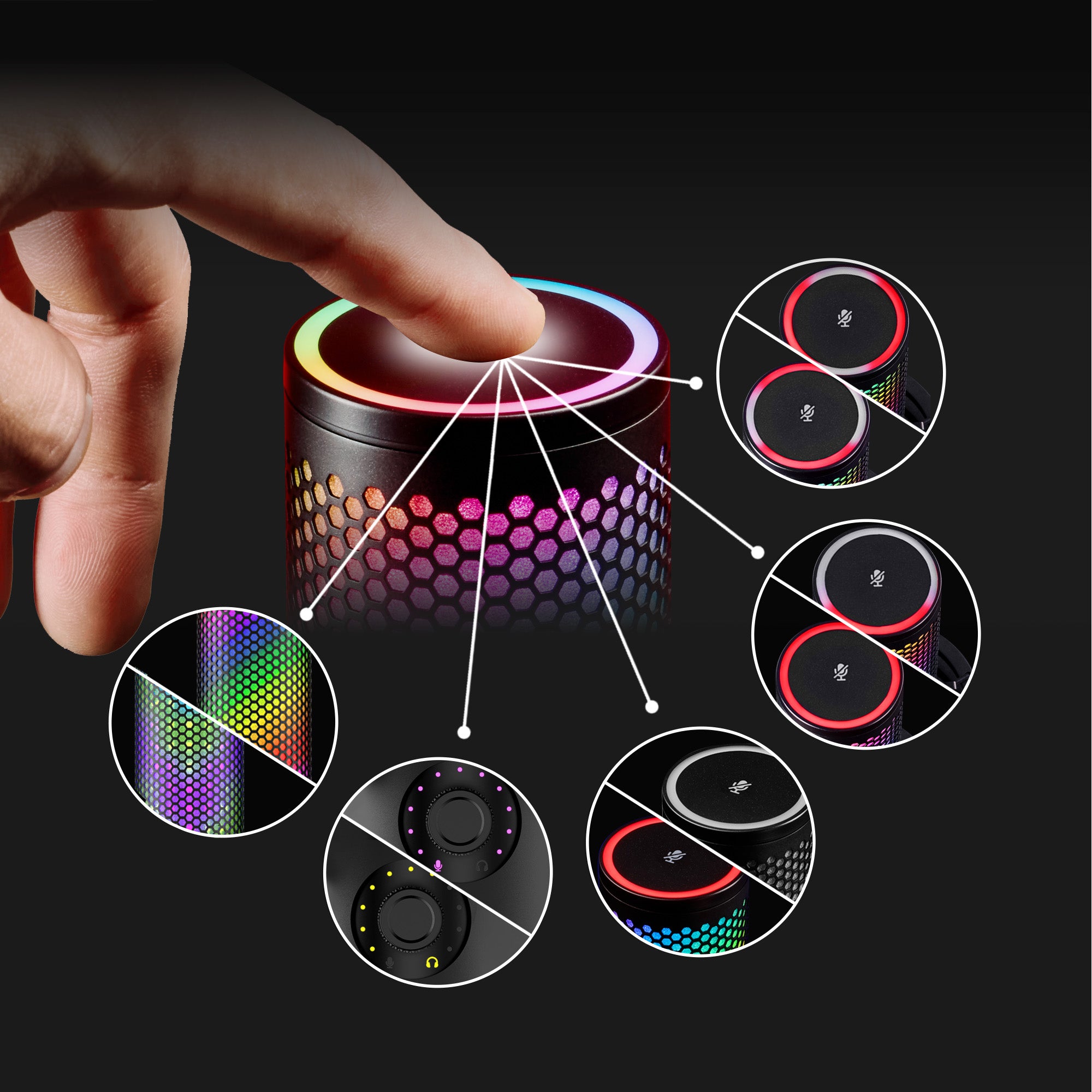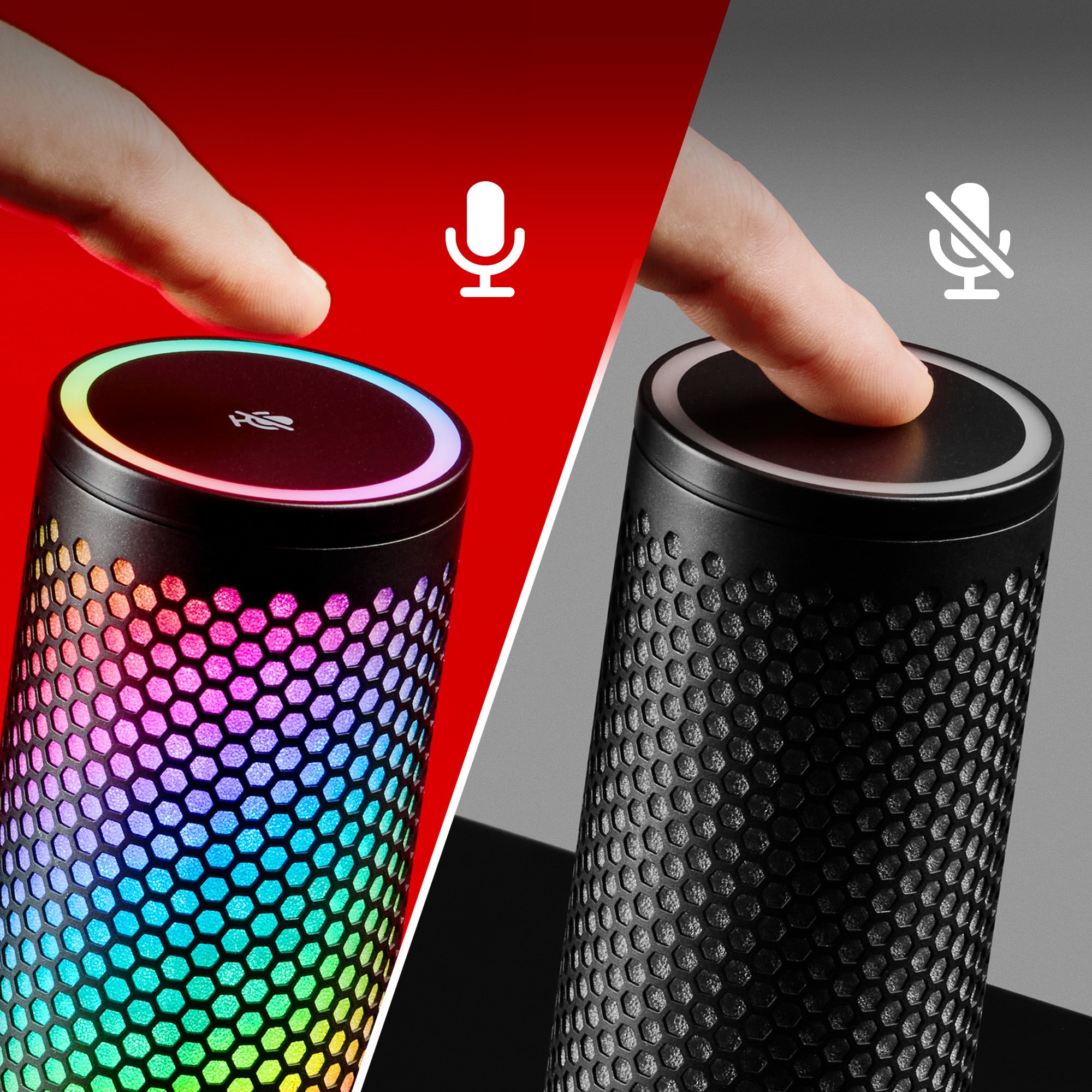 W górnej części mikrofonu znajduje się sensor dotykowy, który umożliwia natychmiastowe wyciszenie urządzenia. Rozwiązanie to eliminuje niepożądane dźwięki kliknięcia mechanicznego przycisku, które mogłyby zostać zarejestrowane podczas nagrania. Stan wyciszenia jest sygnalizowany wizualnie, co pozwala na pełną kontrolę nad transmisją audio bez konieczności sprawdzania ustawień w systemie operacyjnym.
