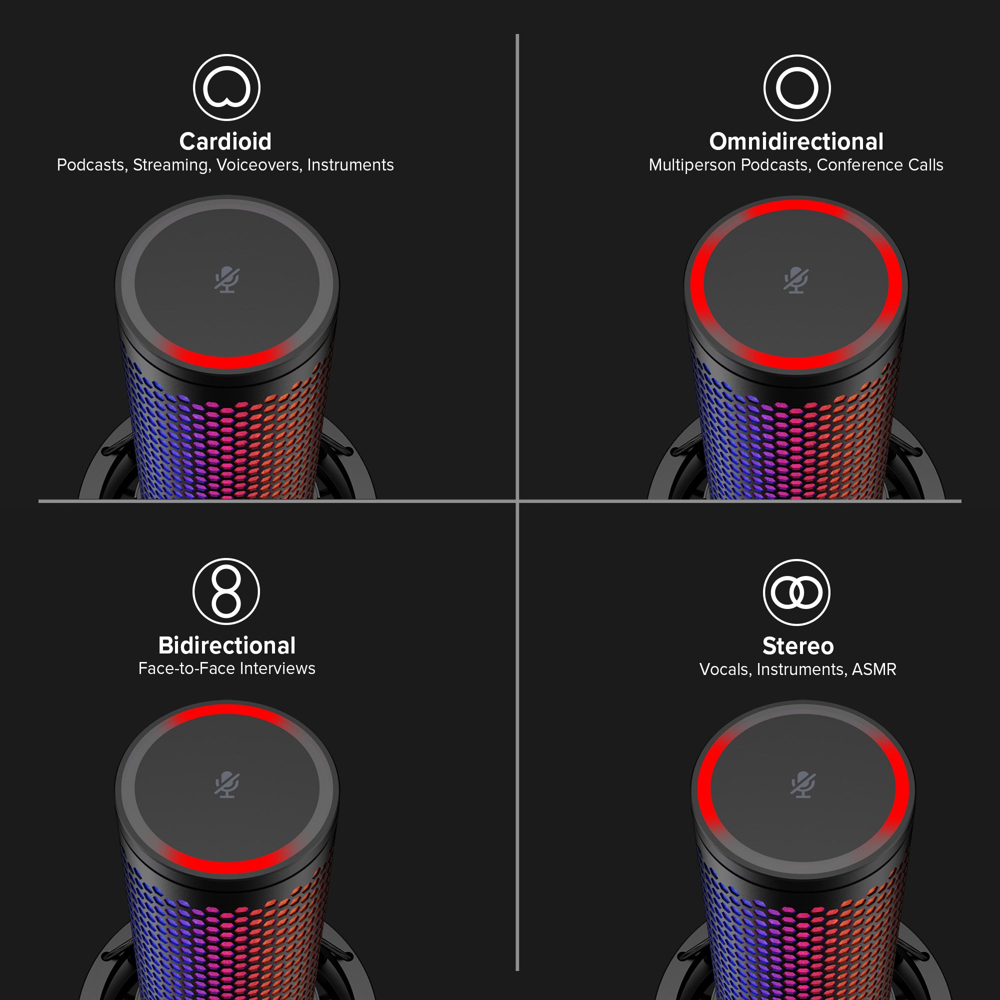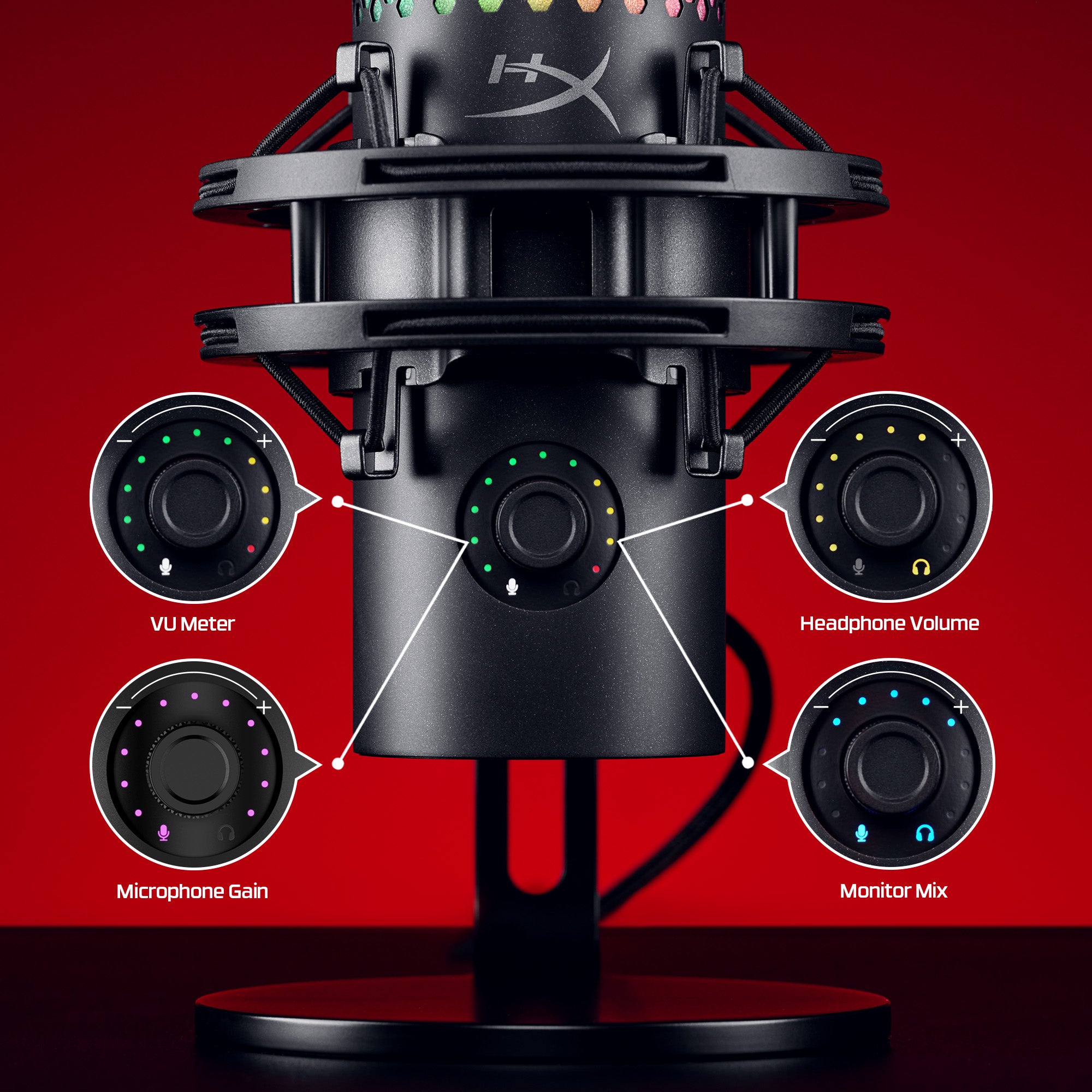 QuadCast 2 S posiada wbudowany miernik VU LED, który wizualizuje poziom natężenia dźwięku w czasie rzeczywistym. Szereg dodatkowych wskaźników diodowych informuje użytkownika o bieżącym trybie pracy, aktywnym wzorcu kierunkowości oraz stanie wyciszenia. Dzięki temu wszystkie parametry techniczne są widoczne bezpośrednio na obudowie, bez konieczności otwierania panelu sterowania w komputerze.
