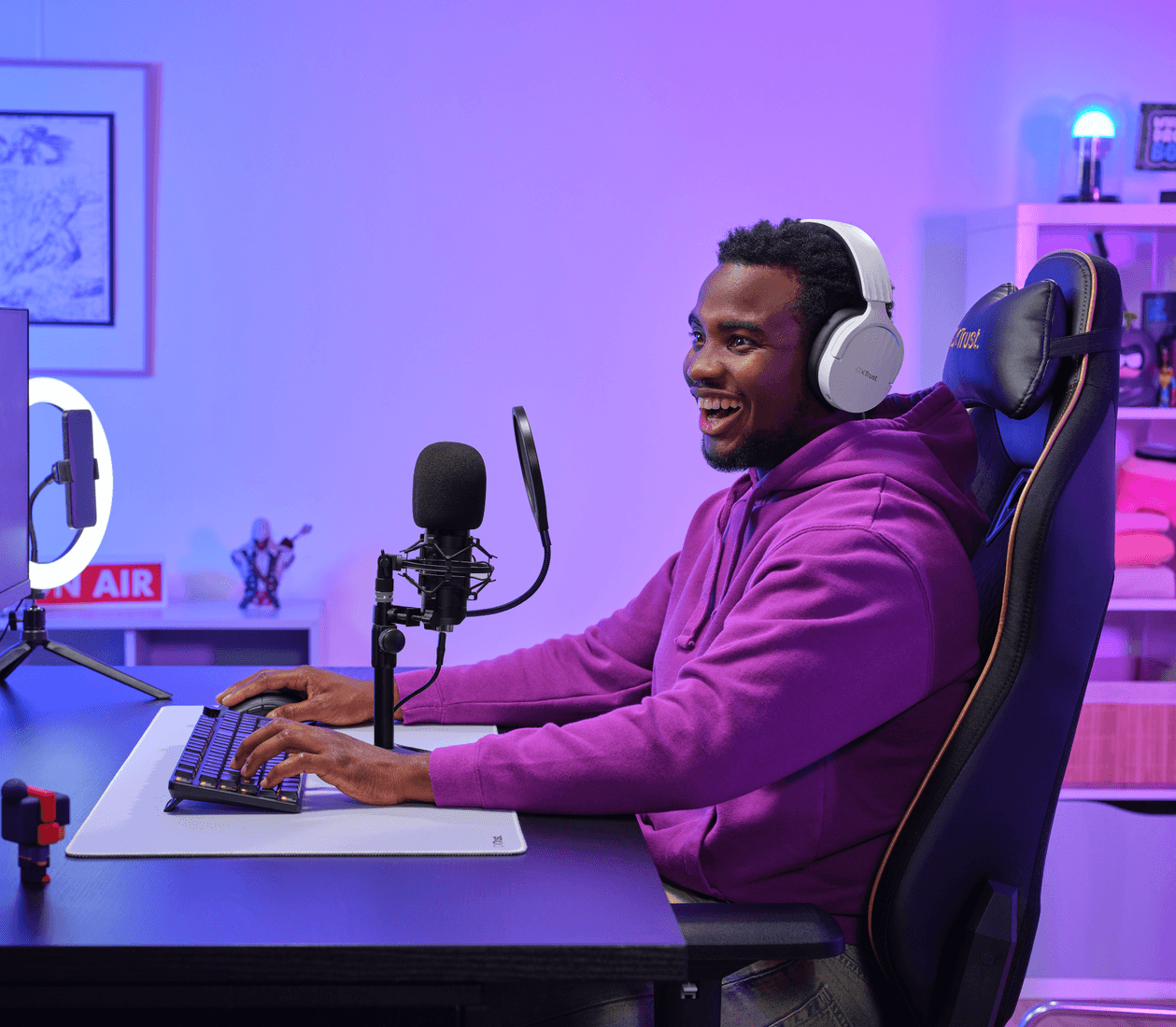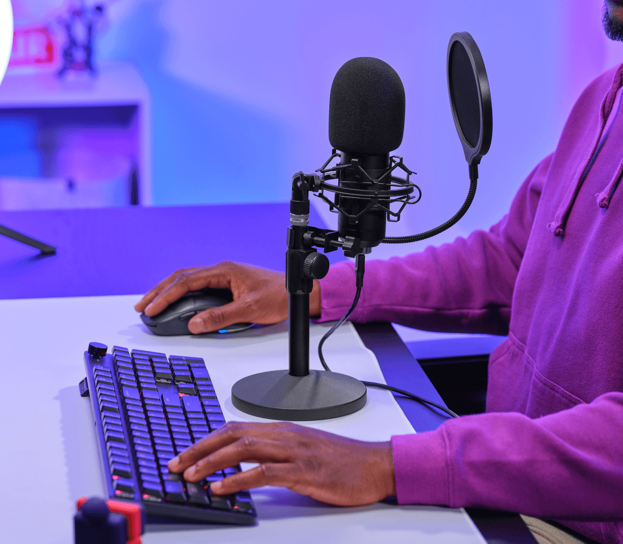 Trust GXT269 Emita II to pojemnościowy mikrofon przeznaczony dla streamerów, podcasterów oraz graczy. Urządzenie dostarczane jest w zestawie z dedykowaną, odlewaną podstawką biurkową, która pozwala na szybkie przygotowanie stanowiska do nagrywania i zapewnia stabilność sprzętu podczas transmisji na żywo.