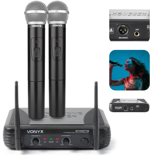 STWM712 marki Vonyx - 2-kanałowy system mikrofonów bezprzewodowych VHF. Oba nadajniki pracują na różnych częstotliwościach. Dobra jakość dźwięku i niezawodność dzięki technice VHF.