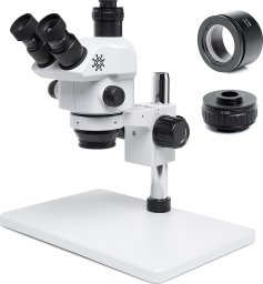 Mikroskop wyróżnia się szerokim polem widzenia, wynoszącym 31,4 mm przy powiększeniu 7x oraz 3,7 mm przy powiększeniu 60x. W zestawie znajduje się soczewka Barlowa 0,5x oraz adapter c-mount do kamery, co zwiększa jego funkcjonalność. Ergonomiczna głowica pozwala na obrót o 360° oraz nachylenie okularów pod kątem 45°, co zapewnia komfort podczas długotrwałych obserwacji.