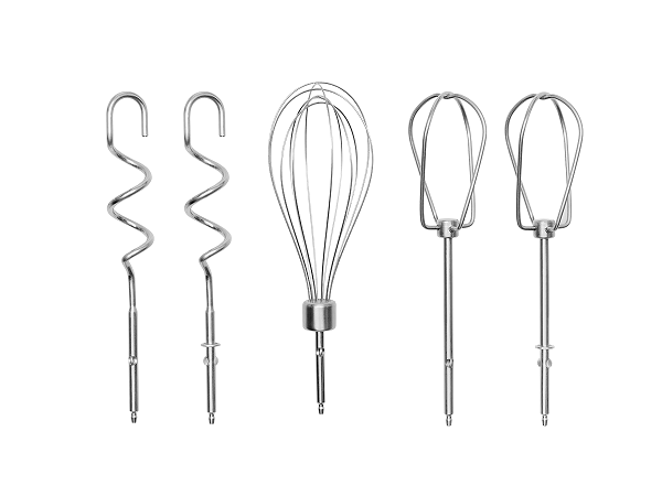 Mikser ręczny SR3210 posiada trzepaczki ze stali nierdzewnej do ubijania piany, żółtek jaj, przygotowywania kremów lub ciasta na omlety i naleśniki, specjalną trzepaczkę idealną do domowej bitej śmietany oraz haki do ugniatania odpowiednie do przygotowania ciasta. Możesz zdjąć trzepaczki i haki, naciskając przycisk bez konieczności dotykania, dzięki czemu Twoje ręce pozostaną czyste.