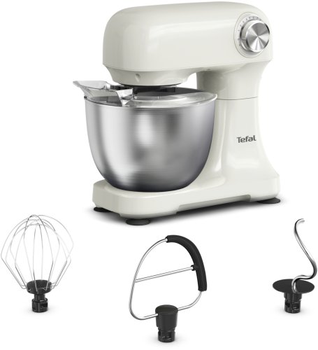 TEFAL QB140AF0 to nie tylko mikser, ale także wszechstronne urządzenie do pieczenia. W zestawie znajdują się akcesoria, takie jak mieszadło do ciasta, hak do wyrabiania ciast ciężkich oraz trzepaczka, co czyni go kompletnym narzędziem do przygotowywania różnorodnych potraw.