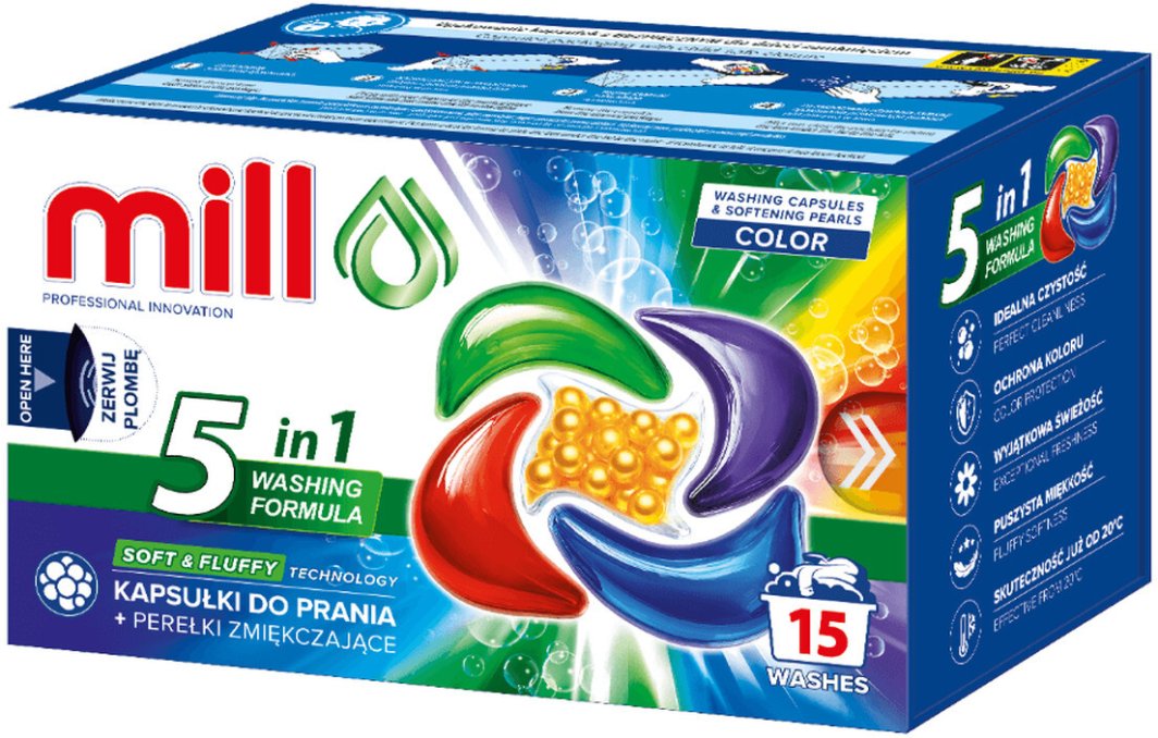 Mill Mill Kapsułki do prania + perełki zmiękczające COLOR 15 szt.