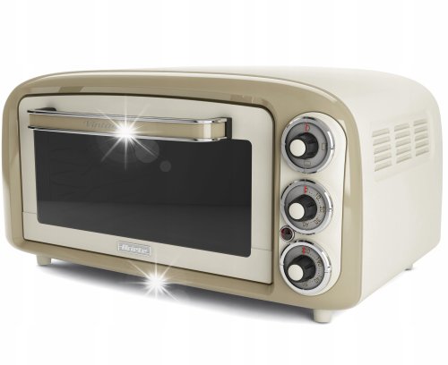 Mini piekarnik Ariete Vintage 979 ma kompaktowe wymiary 47,5 cm szerokości, 40 cm wysokości oraz 24,5 cm głębokości, co czyni go idealnym rozwiązaniem do mniejszych kuchni. Dzięki swoim wymiarom, łatwo go umieścić na blacie, nie zajmując przy tym zbyt wiele miejsca.