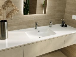 Umywalka DELLA 1800 MIRAGGIO ze sztucznego kamienia to praktyczne rozwiązanie do łazienki w domu, hotelu lub domku letniskowym. Prostokątna forma umywalki harmonijnie dopełni każdą nowoczesną aranżację łazienki. Umywalka ma Nablatowa typ instalacji, proszę wziąć to pod uwagę przed zamówieniem mebli. Sztuczny kamień to twardy i trwały materiał. Głównym składnikiem mieszanki są zmielone wióry marmurowe, boksyt lub piasek kwarcowy, które zostają zmieszane z żywicami poliestrowymi. W strukturze umywalki nie ma mikroporów, przez co rozwój bakterii w grubości ścianek jest niemożliwy. Umywalki Miramarble są pokryte żelem antybakteryjnym Gelcoat ISO NPG. Na ostatnim etapie produkcji umywalka z lanego marmuru jest polerowana specjalną pastą w celu uzyskania odpowiedniego wykończenia powierzchni. Dla uzyskania indywidualnego projektu ceramiki łazienkowej mogą Państwo wybrać dowolny odcień z palety RAL, który jest aplikowany na zewnętrzną stronę produktu. Niektóre modele umywalek mogą być wykonane z piasku kwarcowego (ograniczona liczba modeli) i są dostępne w kolorze szarym lub czarnym. Takie produkty doskonale nadają się do aranżacji łazienki w stylu loftowym. MIRAGGIO to ukraińska marka, która od ponad 10 lat specjalizuje się w produkcji ceramiki łazienkowej z lanego marmuru. Firma posiada własny zakład produkcyjny zlokalizowany w Dnieprze w Ukrainie. Wykorzystujemy unikalny sprzęt, który nie posiada odpowiedników na świecie. MIRAGGIO udziela 10 lat gwarancji na wszystkie produkty marki.