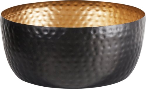 Ozdobna, metalowa miska w stylu dark glam. Wzbogać swój dom o wyjątkową misę dekoracyjną. Wykonana z lekkiego metalu, wspaniale prezentuje się w każdym wnętrzu dzięki wykończeniu w czarnym kolorze. Ozdobiono ją klasycznym wzorem przypominającym plaster miodu a wnętrze pokryto złotą farbą dla odrobiny kontrastu. Misa świetnie sprawdzi się do przechowywania wszelkich drobiazgów wprowadzając przy tym odrobinę industrialnego stylu do każdego pomieszczenia.