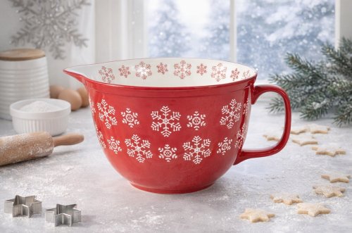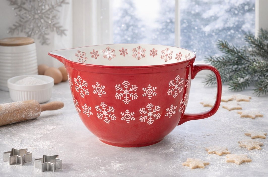 Jej wygląd od razu przywołuje zimowy klimat. Intensywna, świąteczna czerwień łączy się z delikatnym, białym wzorem płatków śniegu, które wyglądają jak małe gwiezdne ornamenty rozrzucone na powierzchni naczynia. Wewnątrz motyw powtarza się subtelnie przy górnej krawędzi, tworząc elegancką ramkę, która pięknie podkreśla zawartość. Całość prezentuje się ciepło, przytulnie i bardzo “zimowo” w sam raz na bożonarodzeniowe wypieki, ale na tyle uniwersalnie, że miska może towarzyszyć Ci również na co dzień.
