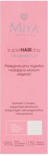 Mgiełka pielęgnacyjna superHAIRday od marki MIYA to nowoczesny produkt, który nie tylko dodaje włosom objętości, ale również je pielęgnuje. Dzięki formule wzbogaconej roślinną keratyną, unosi włosy u nasady, co sprawia, że fryzura wygląda na gęstszą. Mgiełka jest odpowiednia dla wszystkich typów i kolorów włosów, a jej skuteczność została potwierdzona w testach.