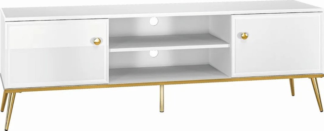Nowoczesna szafka RTV GALENA do salonu Szafka RTV GALENA to elegancki mebel wykonany z wysokiej jakości komponentów i doskonałym wykończeniu, dzięki czemu szafka jest solidna, ale i atrakcyjna wizualnie. Korpus szafki pod telewizor wykonany jest z płyty laminowanej o białej barwie, natomiast frezowane fronty i szczyty zrobiono z białej płyty MDF wykończonej w wysokim połysku. Krawędzie płyt zabezpieczone są obrzeżami ABS chroniącymi przed uszkodzeniami mechanicznymi oraz wilgocią. Uchwyty oraz nóżki mebla są z metalu o złotej błyszczącej barwie, które pięknie współgrają z bielą wspaniale komponując się z wnętrzami utrzymanymi w stylu glamour. Nóżki mają wysokość 18 cm, co umożliwia wygodne uprzątnięcie podłogi pod meblem. Ta nowoczesna szafka RTV ma po bokach dwie szafki, które zamontowane są na zawiasach z cichym domykiem, co podnosi komfort użytkowania mebla. Pomiędzy szafkami znajdują się dwie półki, na których ustawić można dodatkowy osprzęt do telewizora, a dzięki przepustom kablowym znajdującym się z tyłu łatwo wyprowadzimy okablowanie. Szafka RTV GALENA jest jednym z elementów kolekcji mebli pozwalających na wyposażenie salonu w eleganckie i funkcjonalne meble. Cechy produktu produkt polski, elegancka komoda do salonu, korpus z płyty laminowanej o białej barwie, frezowane fronty z płyty MDF w białym połysku, obrzeża oklejone ABS, uchwyty i nóżki z metalu w złotym kolorze, nóżki o wysokości 18 cm, dwie półki na akcesoria do telewizora, z tyłu półek znajdują się przepusty kablowe, dwie szafki po bokach, zawiasy z cichym domykiem, do samodzielnego montażu, w swojej ofercie posiadamy szeroki wybór mebli pozwalających na kompleksowe wyposażenie mieszkania.