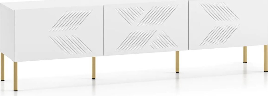 Stojąca szafka RTV KLARA pod telewizor Szafka RTV KLARA to element kolekcji mebli, które powstały z myślą o wyposażeniu salonu w piękne i funkcjonalne meble. Ta polskiej produkcji szafka pod telewizor podobnie, jak pozostałe bryły z kolekcji wyróżnia się atrakcyjnym frezem znajdującym się na frontach mebla. Korpus szafki RTV zrobiony został z płyty laminowanej wysokiej jakości cechującej się dużą odpornością na uszkodzenia mechaniczne, wysoką temperaturę oraz wilgoć. Fronty natomiast wykonane są z płyty MDF o białej matowej barwie. Krawędzie płyt zabezpieczone są obrzeżami ABS chroniącymi przed zadrapaniami i wilgocią. Jednocześnie zastosowanie obrzeży ABS podnosi estetykę wykończenia mebla. Nogi szafki RTV KLARA są metalowe i dostępne w dwóch kolorach do wyboru: czarne lub złote, co pozwala na dopasowanie szafki do posiadanych mebli, czy aranżacji. Szafka ze złotymi nogami doskonale prezentować się będzie w salonie w stylu glamour, natomiast przy zastosowaniu czarnych nóg wspaniale sprawdzi się w nowoczesnych wnętrzach. Nogi o wysokości 18 cm ułatwią utrzymanie czystości pod meblem i umożliwią swobodne poruszanie się robota sprzątającego. Szafka RTV wyposażona jest w trzy szafki, a każda otwierana jest przy pomocy podnośnika gazowego. Wewnątrz z powodzeniem przechowywać można akcesoria do telewizora, konsolę, czy inne niezbędne przedmioty. Cechy produktu produkt polski, praktyczna szafka pod telewizor do salonu, korpus biały z płyty laminowanej, fronty frezowane z płyty MDF w kolorze biały mat, obrzeża oklejone ABS, nogi metalowe do wyboru w kolorze czarnym lub złotym, wysokość nóg - 18 cm, szafki wewnątrz o maksymalnym obciążeniu - 10kg, szafki otwierane przy pomocy podnośników gazowych, do samodzielnego montażu, w swojej ofercie posiadamy szeroki wybór mebli pozwalających na kompleksowe wyposażenie mieszkania.
