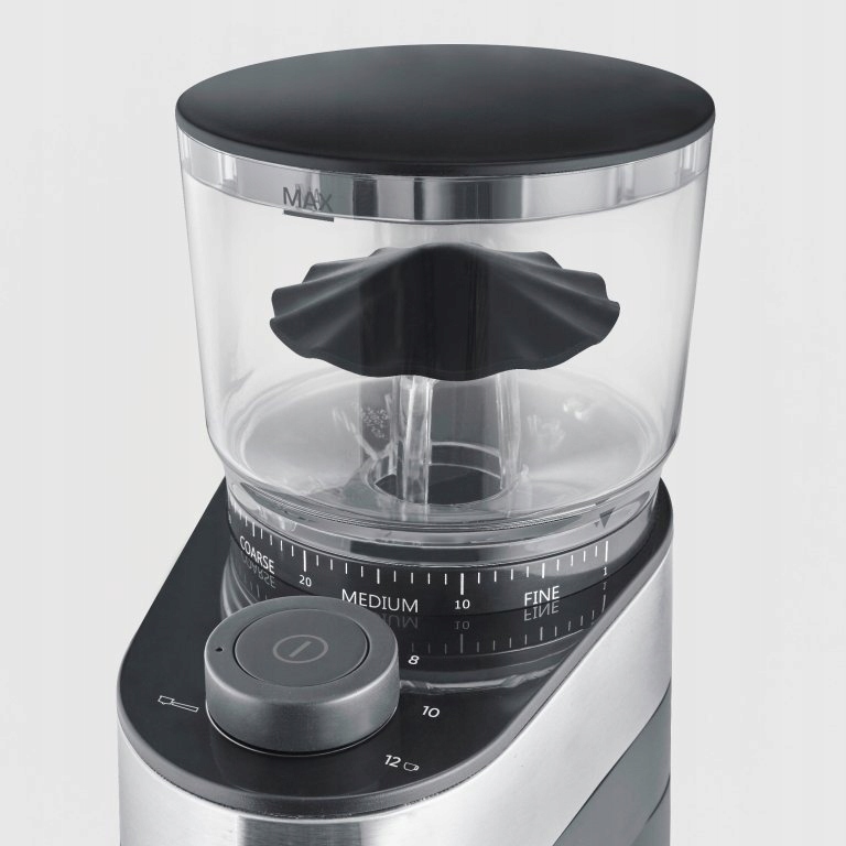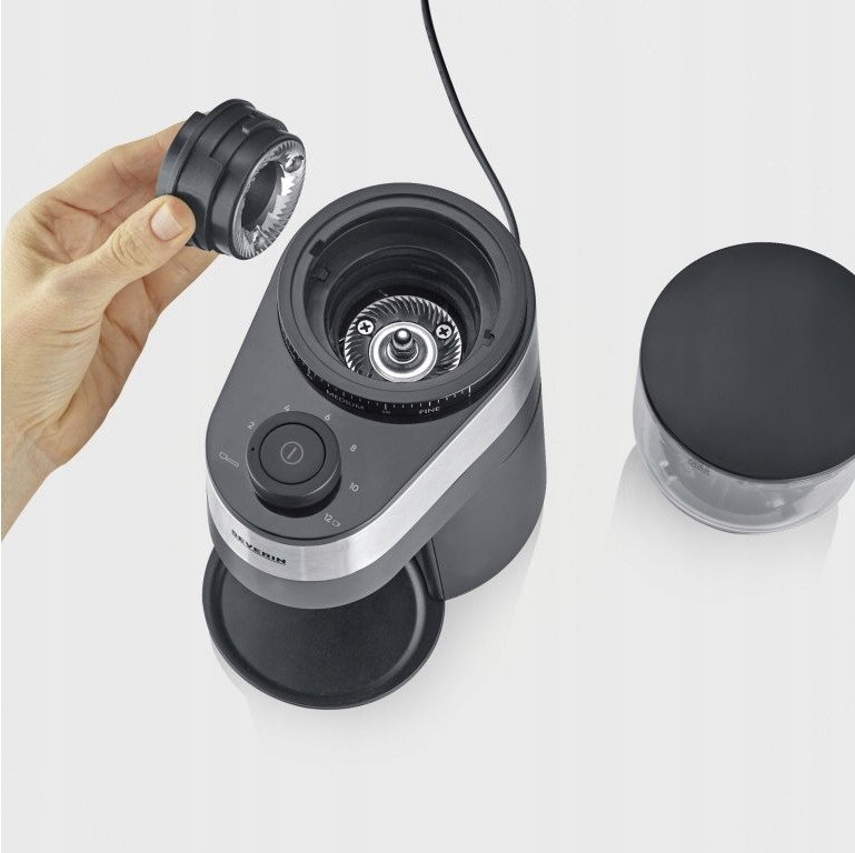 Młynek wyposażony jest w przezroczysty, wyjmowany pojemnik na ziarna o pojemności 240 g, co pozwala na zmielenie większej ilości kawy za jednym razem. Dodatkowo, zmielona kawa trafia do osobnego, również wyjmowanego pojemnika o pojemności 130 g, wyposażonego w szczelne wieczko, które zapobiega wysypywaniu się kawy oraz pomaga utrzymać jej świeżość. Tak przemyślana konstrukcja zapewnia wygodę i porządek podczas przygotowywania kawy.