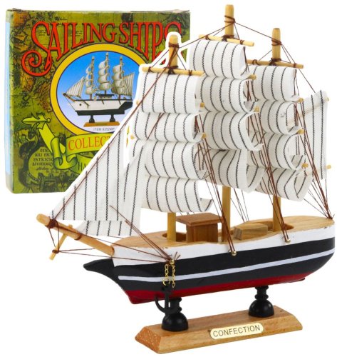 Ten kompaktowy model trójmasztowego żaglowca to elegancka replika klasycznego statku rejsowego o dynamicznej, smukłej sylwetce. Kadłub w kontrastowej kolorystyce czerni, bieli i czerwieni podkreśla ozdobny charakter jednostki i nadaje jej wyrazistego wyglądu. Charakterystyczne żagle w cienkie pasy, trójmasztowa konstrukcja oraz realistyczne olinowanie nadają modelowi wyjątkowo ekspozycyjny charakter.