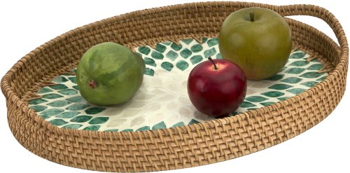 Piękna, ręcznie wytworzona taca rattanowa. Środek wypełniony jest cudownym zdobieniem wykonanym z masy perłowej. Turkusowe elementy przypominające łezki oraz wplecione w środku perłowe łezki świetnie uzupełniają się na kremowym tle tworząc przepiękną dla oka kompozycję.