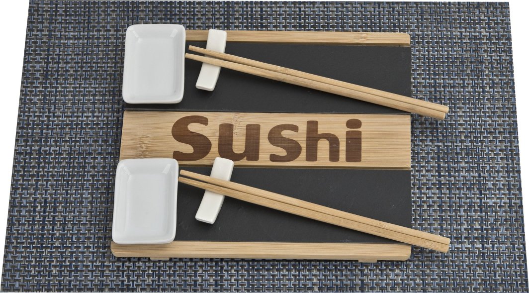 Zestaw zawiera: 2 komplety pałeczek, 1 drewniana deska, 2 deski z łupka, 2 podstawki pod pałeczki, 2 miseczki.