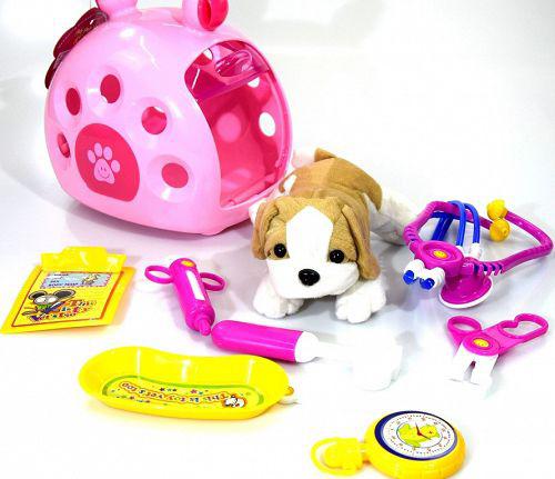 W zestawie: pluszowy piesek, buda z uchwytem, stetoskop, waga, karta pacjenta, strzykawka, młoteczek, szczypce, pęseta.