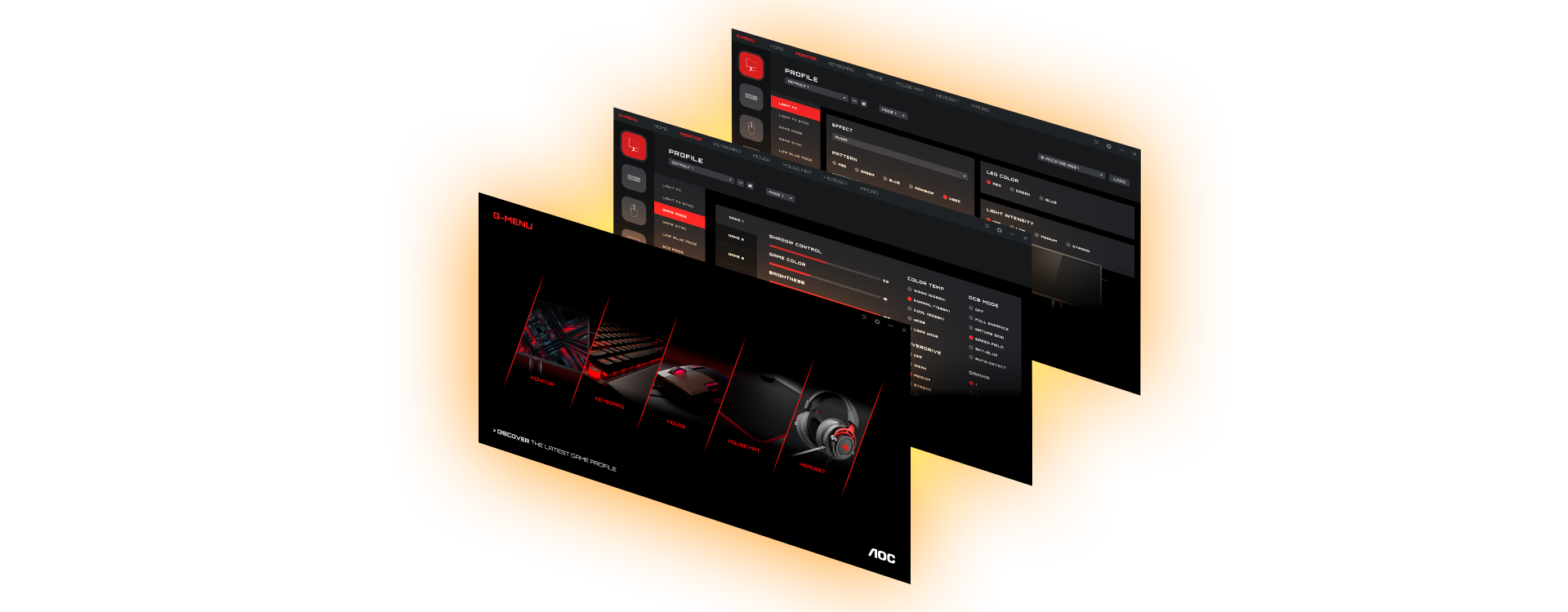 Maksymalna immersja: monitory AOC są wyposażone w specjalne oświetlenie z tyłu urządzenia, które oświetla zestaw do gry w różnych kolorach. Wybierz dowolny kolor, dopasuj go do innych urządzeń AOC i przetestuj różne układy oświetlenia.