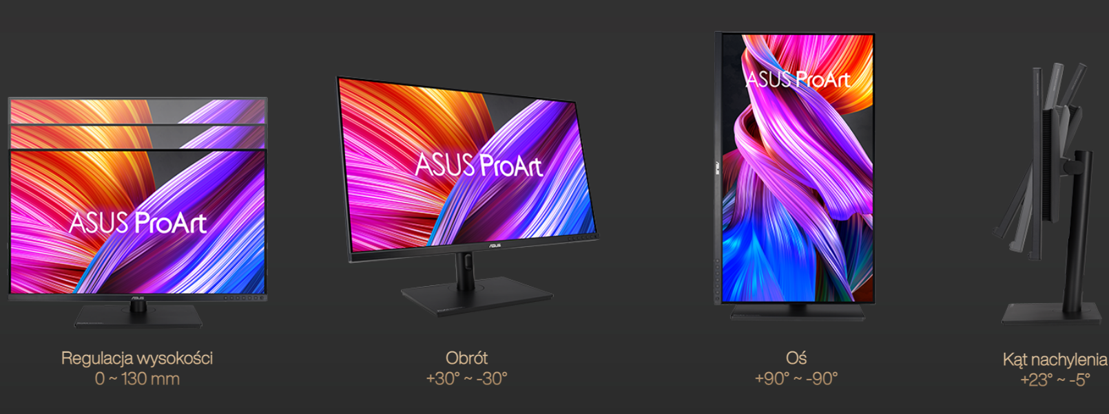 Monitory z serii ProArt zapewniają Ci pełen komfort podczas oglądania i korzystania, oferując ergonomicznie zaprojektowane podstawki z możliwością dostosowania nachylenia, obrotu w poziomie, obrotu pod kątem 90° do ustawienia pionowego (pivot) oraz regulacji wysokości. Możliwość obrotu pod kątem 90° w stronę zgodną lub przeciwną do ruchu wskazówek zegara w celu korzystania z monitora w trybie pionowym jest bardzo praktyczna podczas pracy nad długimi dokumentami, programowania, albo przeglądania stron internetowych. Ponadto szybko odłączana podstawka ułatwia montaż ekranu za pośrednictwem zintegrowanego uchwytu ściennego VESA – bez użycia śrub, a więc praktycznie w ciągu kilku sekund!