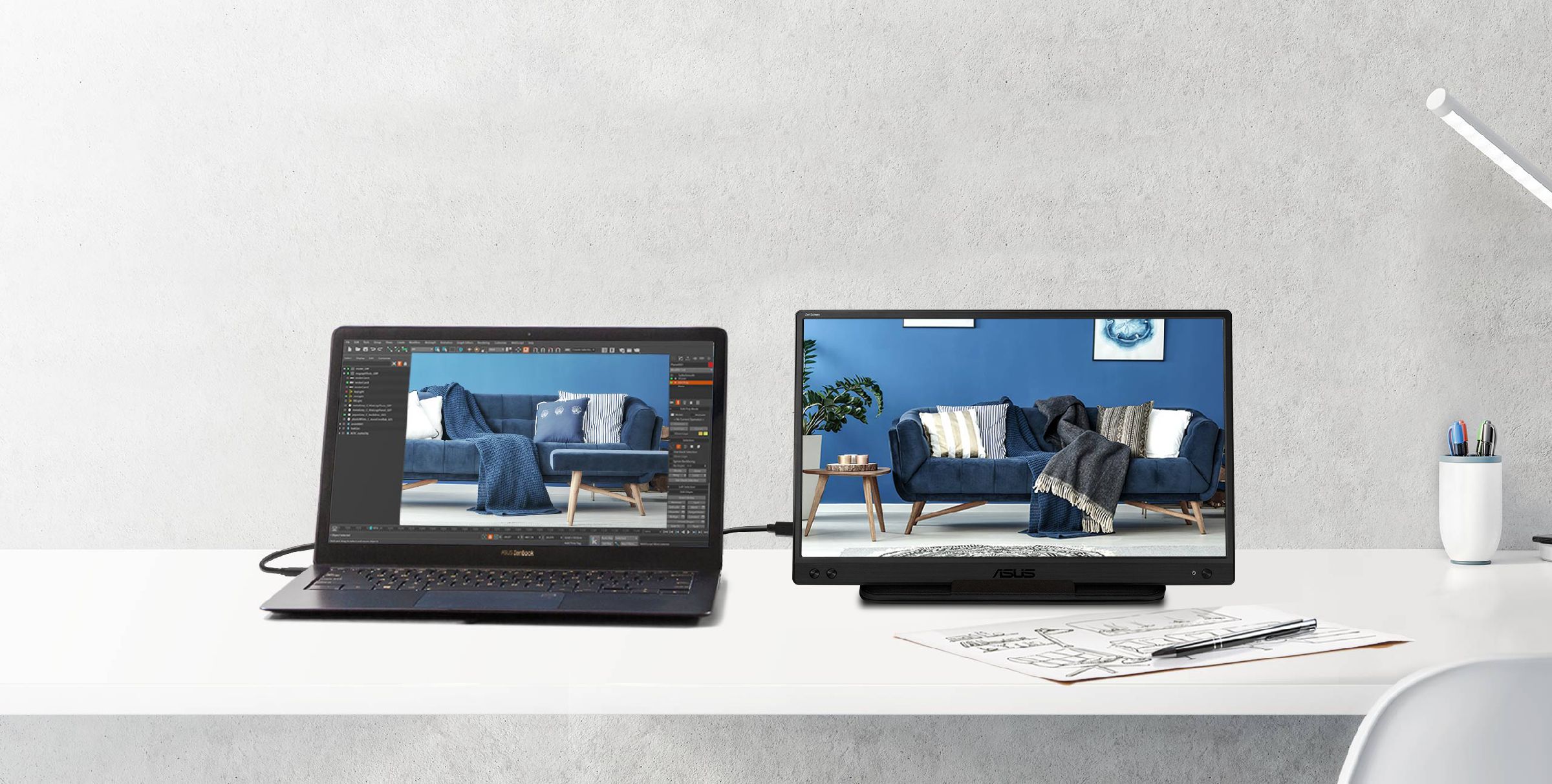 ASUS ZenScreen jest idealny do użytkowania w podróży. Ten elegancki monitor przenośny charakteryzuje się niską wagą i smukłym profilem, dzięki czemu z łatwością mieści się w każdej torbie podróżnej, umożliwiając użytkownikowi wydajną pracę w każdej chwili i w każdym miejscu.