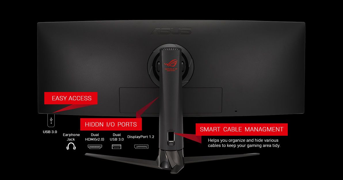 ROG Strix XG43VQ oferuje szeroki wybór opcji połączeń, w tym DisplayPort 1.2, dwa porty HDMI i dwa porty USB 3.0.
