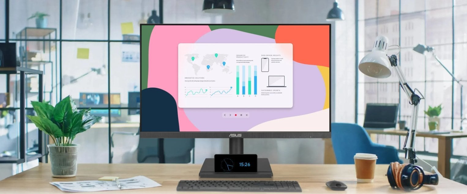 ASUS DisplayWidget Center to aplikacja, która pozwala na dostosowanie ustawień monitora za pomocą myszy, zamiast korzystania z przycisków na monitorze.