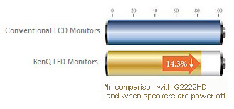 Urządzenie BenQ GL2250 spełnia szczegółowe wymagania programu ENERGY STAR ® dla monitorów komputerowych. Oznacza to dużą oszczędność energii, a co za tym idzie – pieniędzy, w porównaniu do innych sprzętów. Jednym z podstawowych kryterium jest pobór energii elektrycznej w spoczynku mniejszy niż 0,5 W. Certyfikowane monitory sprawdzą się szczególnie tam, gdzie będą użytkowane przez długie godziny. Energooszczędne panele LED zapewniają większą oszczędność energii o 14,3% *.