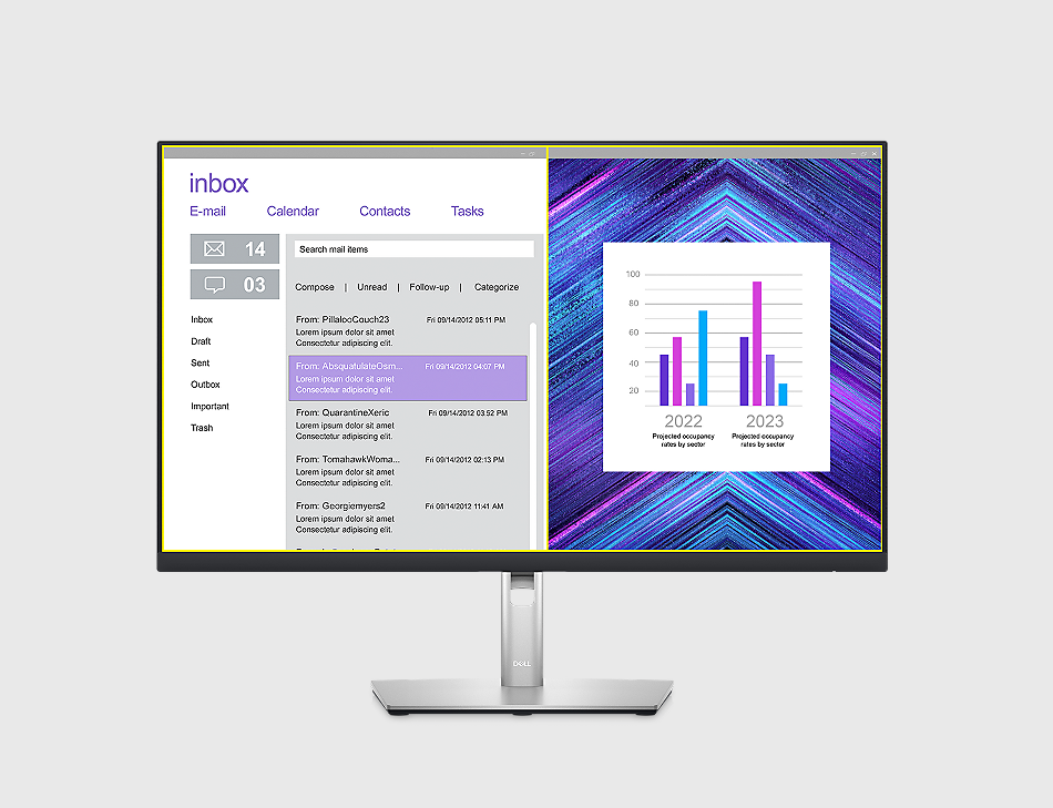 Porządek na biurku: Twój monitor może działać jako centrum produktywności dzięki portowi RJ45 do połączenia przewodowego z siecią Ethernet i USB-C z możliwością zasilania mocą do 90 W – a to wszystko bez bałaganu na biurku.