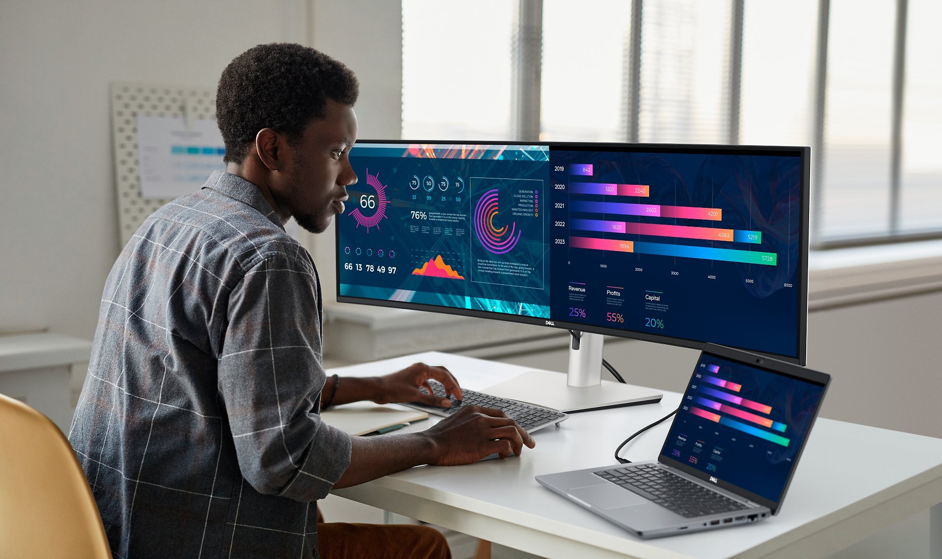 Uproszczenie przepływu pracy: pojedynczy kabel USB-C przesyła dane i sygnał wideo i zapewnia do 90W mocy.