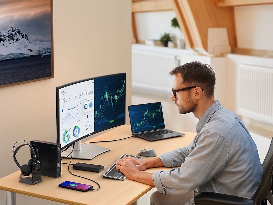 Wiele opcji łączności: lepsze miejsce pracy z wieloma portami komunikacyjnymi, w tym USB-C (zasilanie mocą do 90 W), RJ45 (Ethernet), DP1.4 i HDMI. Szybki dostęp do portów USB-C (ładowanie mocą do 15 W) i superszybkich portów USB 10 Gb/s umożliwia wygodną łączność i szybki transfer danych.