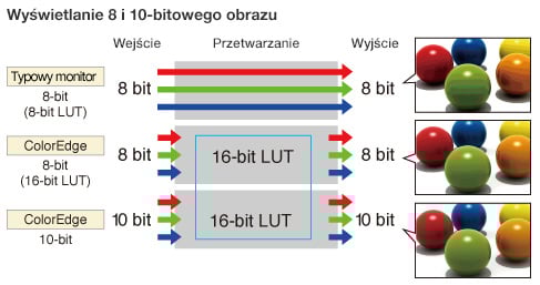 Korzystając z wejścia sygnałowego DisplayPort lub HDMI możliwe jest dostarczanie do ColorEdge CG2420 10-bitowej informacji o kolorze*. Dzięki 16-bitowej tablicy LUT monitor jest w stanie odtworzyć nawet miliard kolorów jednocześnie. W porównaniu z sygnałem 8-bitowym to 64 razy więcej kolorów, co zapewnia płynniejsze przejścia tonalne i zmniejszenie współczynnika Delta-E pomiędzy sąsiednimi kolorami.