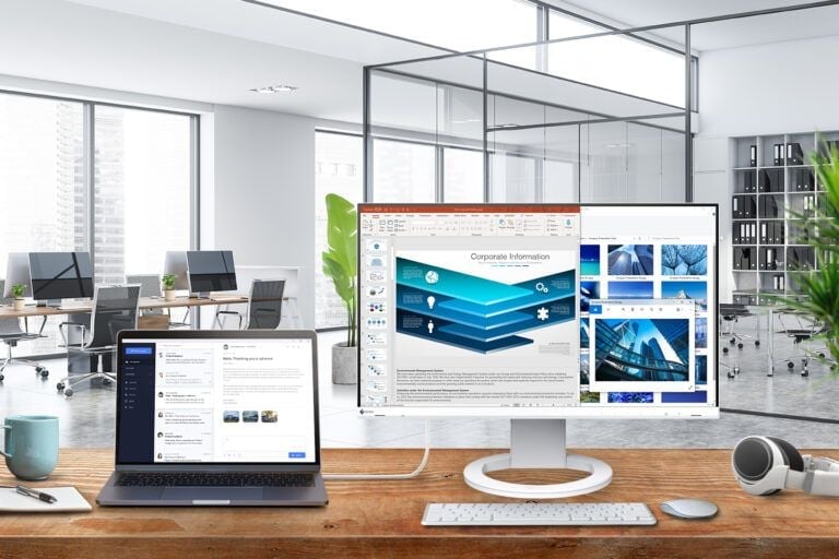 Dzięki swoim kompaktowym rozmiarom (537,8 mm szerokości i 230 mm głębokości) monitor bez problemu zmieści się w niewielkim domowym biurze lub przestrzeni dzielonej z innymi.