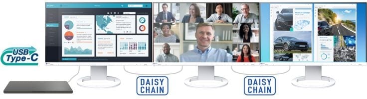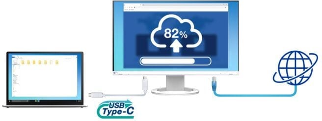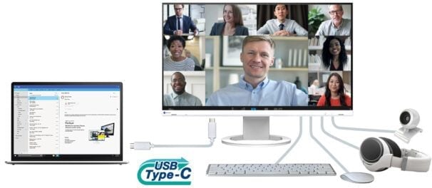FlexScan EV2490 wyposażono w złącze USB-C umożliwiające odbieranie sygnałów audio, wideo i USB, ładowanie podłączonych urządzeń, a nawet przesyłanie sygnału sieciowego. Dzięki temu osoby przenoszące się między stacjami roboczymi lub pracujące poza biurem mogą łatwiej i szybciej podłączyć laptopa.