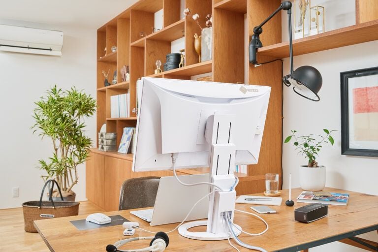FlexScan EV2490 ma bezramkową konstrukcję, które doskonale wpasowuje się w minimalistyczne trendy. Niewielka odległość między krawędzią obudowy a obszarem wyświetlania obrazu sprawia, że monitor świetnie wtapia się w otoczenie.