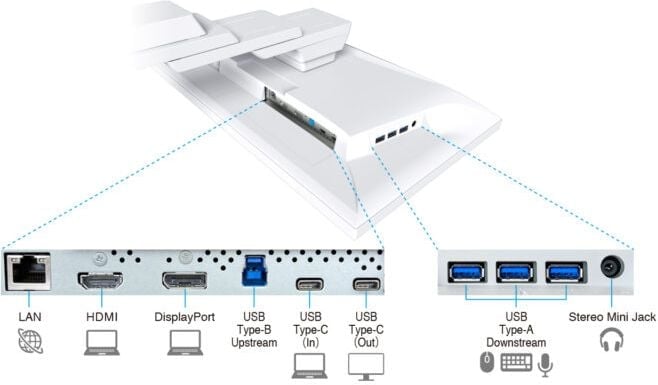 W nowoczesnych laptopach często brakuje złączy wejściowych, ponieważ producenci rezygnują z nich, by „odchudzić” swoje urządzenia i sprawić, by były bardziej przenośne. Wbudowany interfejs UBS-C w modelu EV2490 daje dostęp do trzech złączy USB-A i jednego USB-C, umożliwiających podłączenie urządzeń peryferyjnych takich jak mysz, klawiatura lub kamerka internetowa.