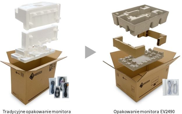 EV2490 jest pierwszym monitorem z serii FlexScan pakowanym bez użycia plastiku i styropianu. Na czas transportu monitor wkłada się do formy z pulpy papierowej wytwarzanej z materiałów papierowych, a kable zamiast w plastikową torebkę zawija się w arkusz z masy celulozowej.