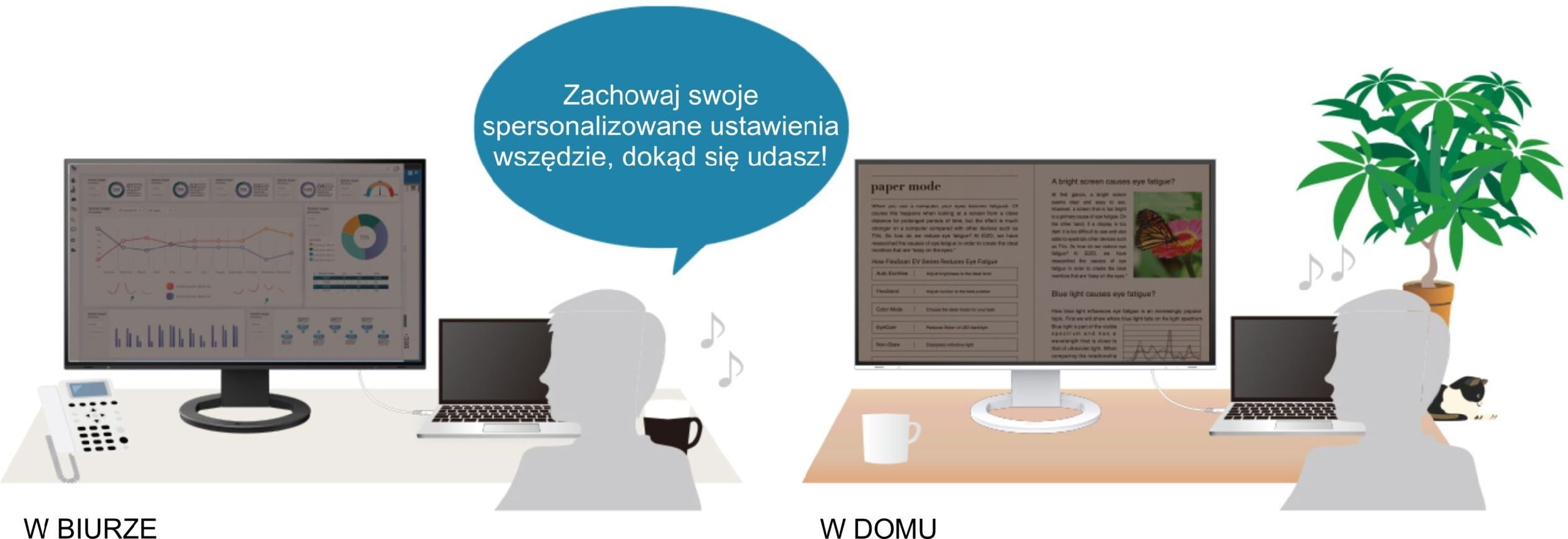 Funkcja Color Briefcase pozwala bez wysiłku zarządzać swoimi własnymi preferencjami ekranu i „przenosić je ze sobą”, nawet do innych monitorów. Ustawienia są automatycznie wprowadzane, wystarczy podłączyć laptop do monitora za pomocą kabla USB-C. Takie rozwiązanie upraszcza konfigurację i proces podłączania w biurze czy na stanowiskach współdzielonych, jak również podczas pracy zdalnej.