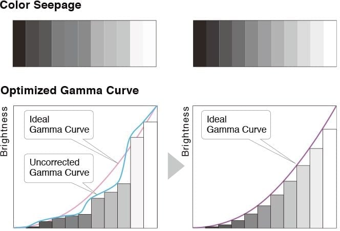 Monitor korzysta z 10-bitowej tablicy LUT (look-up-table), aby wyświetlać najbardziej odpowiednie odcienie w sygnale 8-bitowym. Dzięki temu wyświetlane przejścia kolorów są płynne. Każdy monitor jest indywidualnie regulowany w fabryce na podstawie pomiarów wartości RGB, co sprawia, że obraz wyświetlany jest optymalnie zaraz po wyjęciu z pudełka.