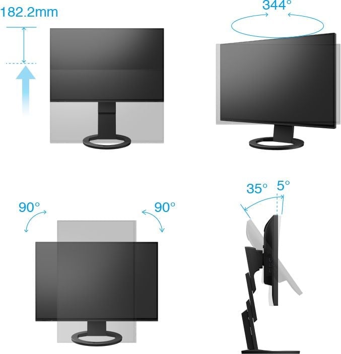 Stopka ma szeroki zakres regulacji, możliwa jest regulacja w płaszczyźnie pionowej, poziomej, a także odchylenie ekranu. Dzięki temu można ustawić go w najbardziej dogodnej pozycji. Po ustawieniu na maksymalnej wysokości, pod monitorem można zmieścić mały laptop, oszczędzając miejsce na biurku. Na ekranie o rozdzielczości 1920 x 1200 wyświetlanych jest o 11% więcej informacji niż na konwencjonalnym monitorze full HD (1920 x 1080), eliminując konieczność częstego skrolowania zawartości.
